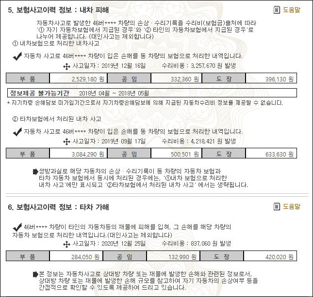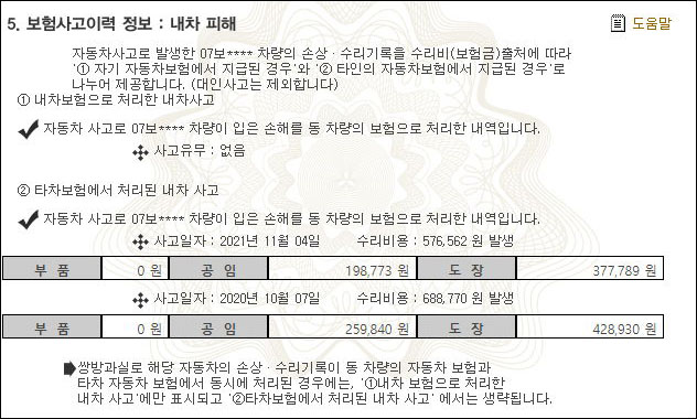 B차량 보험처리내역 보니 2번모두 범퍼 긁혀서 미수선 받은정도.. 느낌입니다. ㄷ